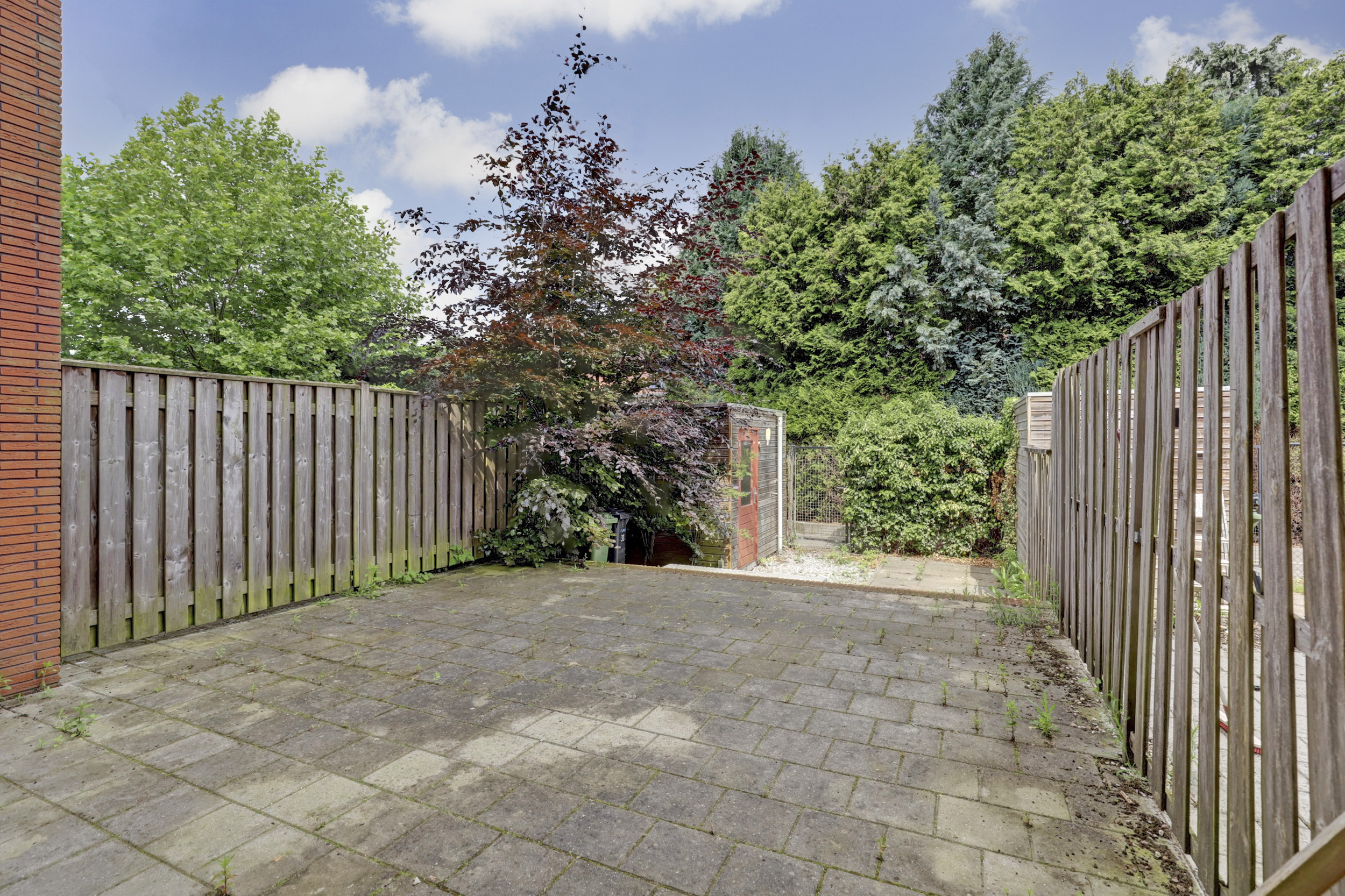 De achtertuin is circa 7,5 meter diep en voorzien van een houten berging met elektra en een eigen achterom.